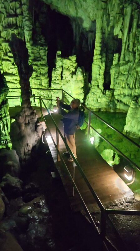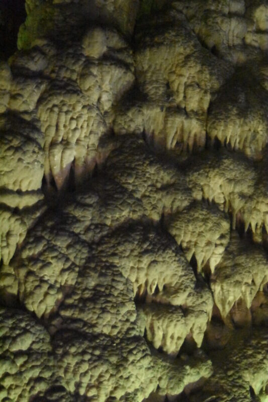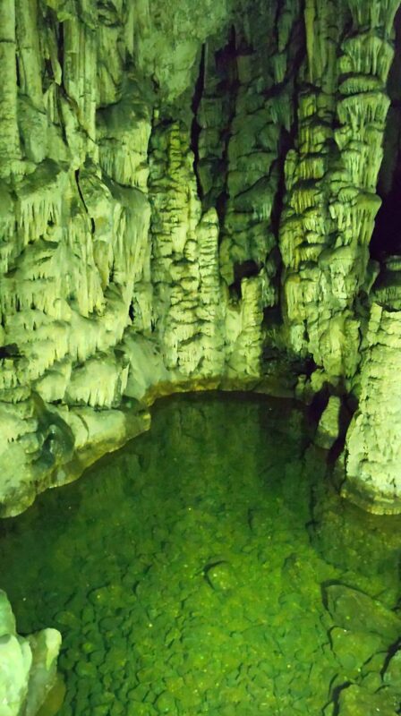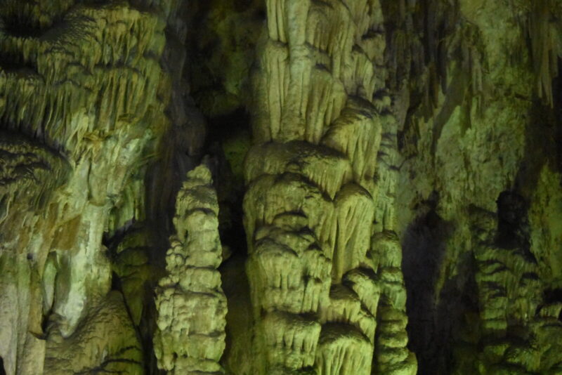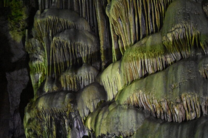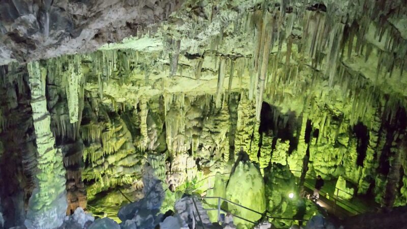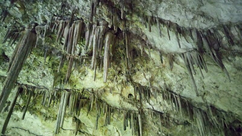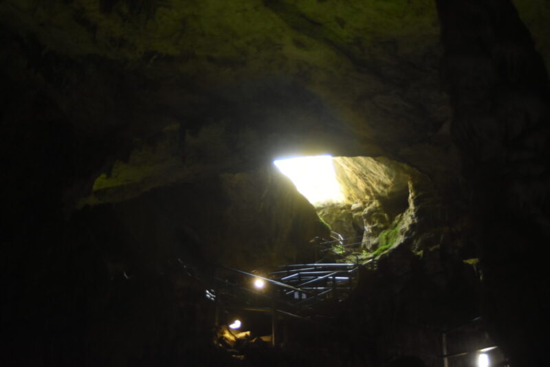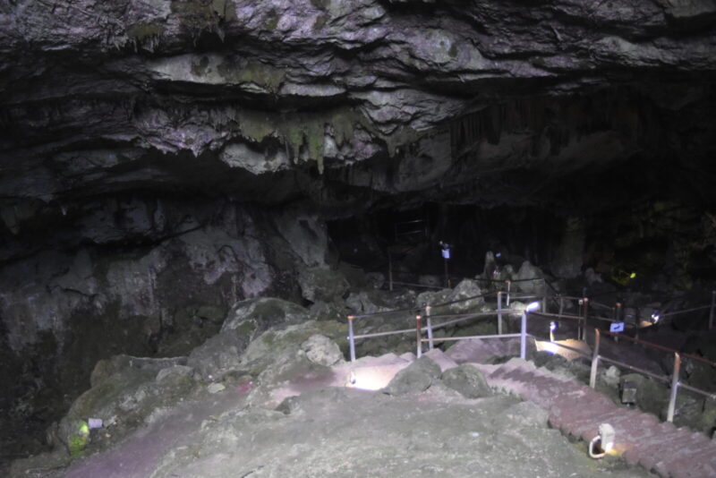 洞窟の中はひんやりと暗く、鍾乳石が垂れ下がる幻想的な空間が広がります。