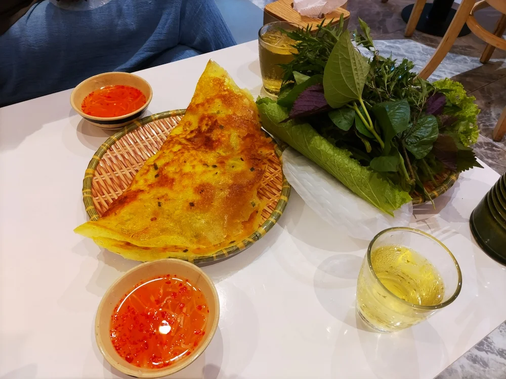バインセオは、米粉とココナッツミルク、ターメリックを混ぜた生地を薄く焼き、豚肉、エビ、もやしなどの具材を包み、香草と一緒にレタスで巻いて、魚醤ベースの甘酸っぱいタレ(ヌクチャム)で食べるのが特徴です。