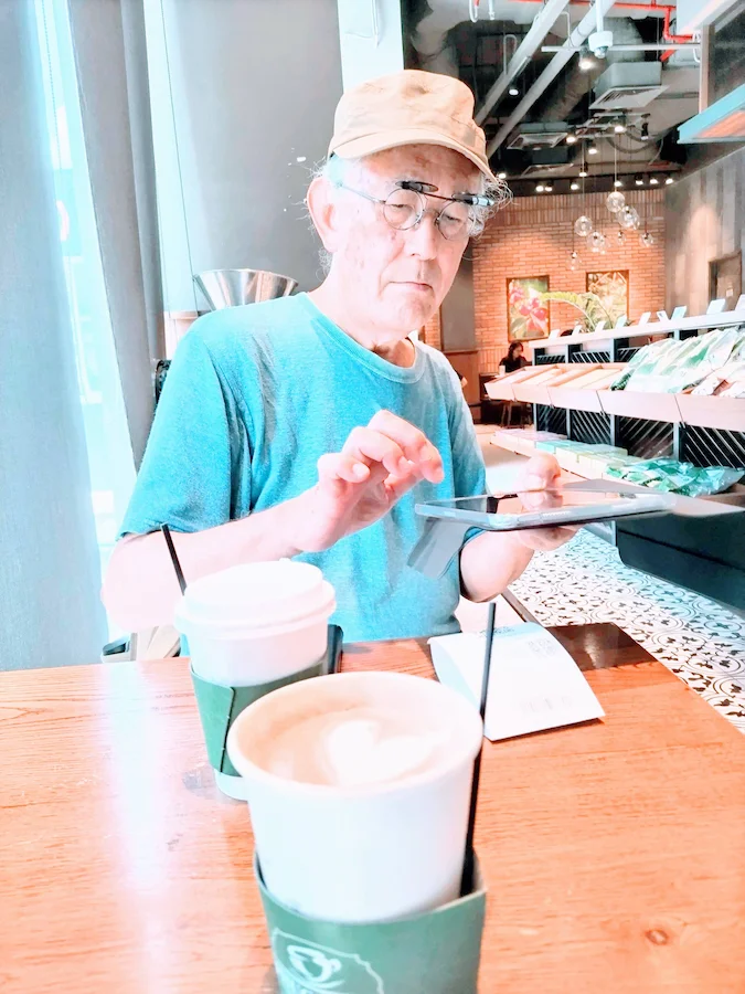 カフェではiPhone miniを片手に