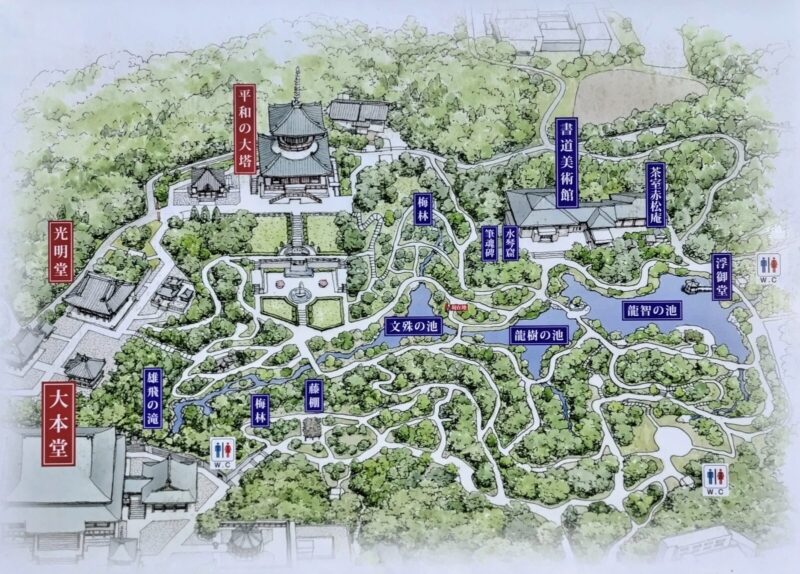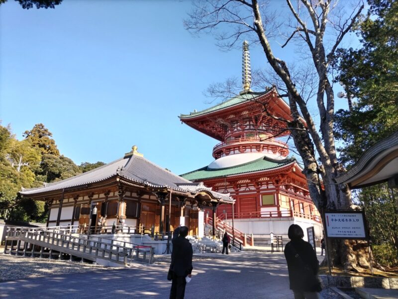 大本堂の奥には平和大塔がそびえ立ち、仏教の世界観を立体的に表現した内部の仏像や壁画が見どころとなっています。